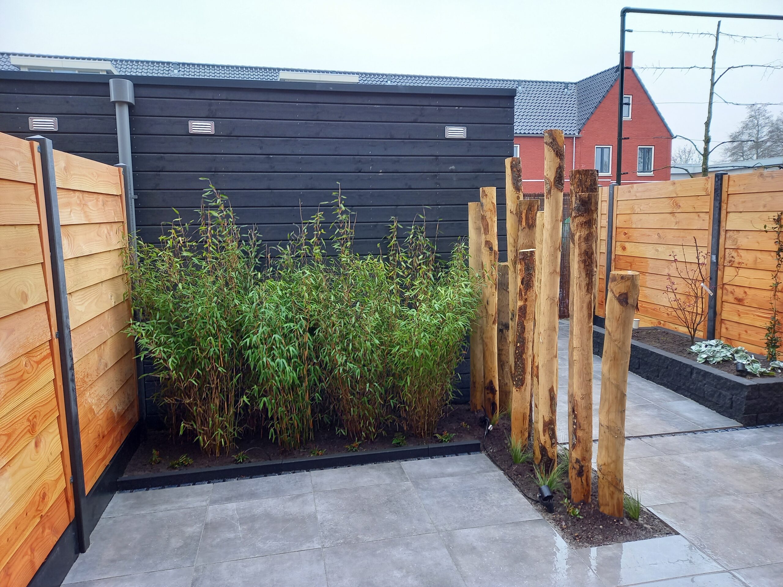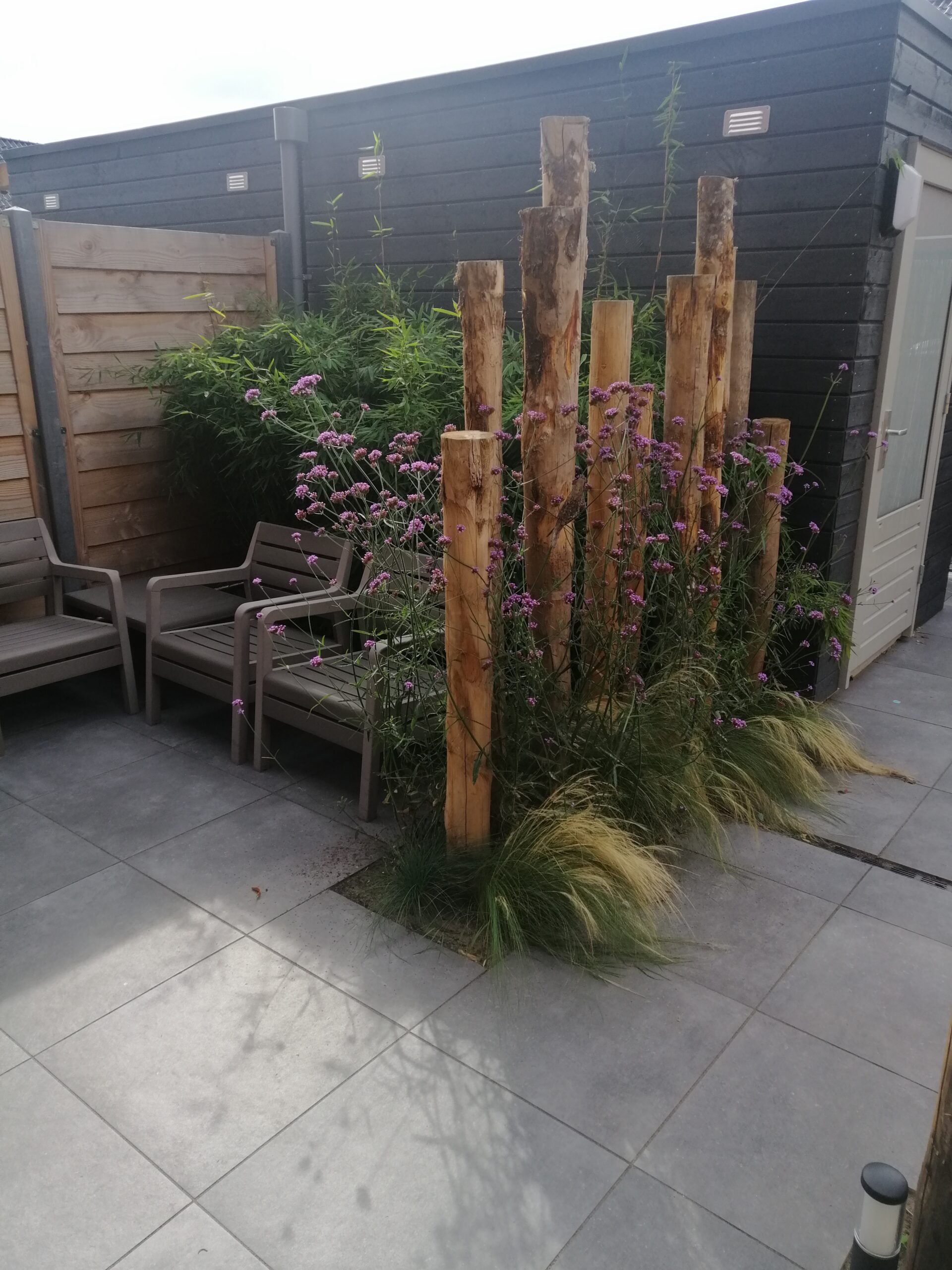Aanleg achtertuin in Oud-beijerland. In deze achtertuin hebben wij het ontwerp simpel gehouden, dit omdat de ruimte beperkt is. Er is gebruik gemaakt van strakke tegels in de tuin. Om het geheel speelser te maken zijn er kastanje palen geplaatst in verschillende hoogtes. Ook is de tuin aangeplant met soorten die een wilde groeiwijze hebben. Het resultaat; een strakke tuin met leefruimte en groen!