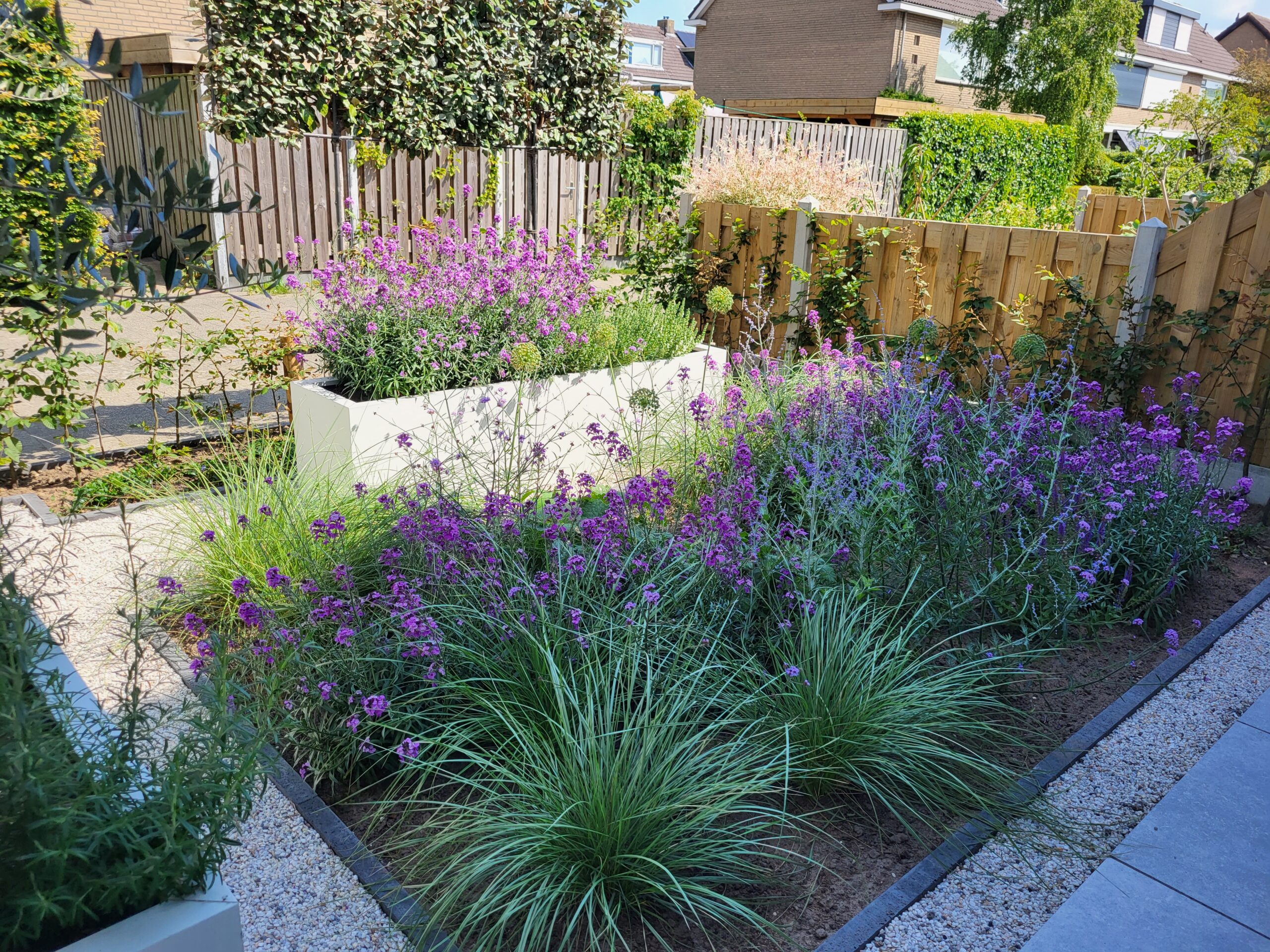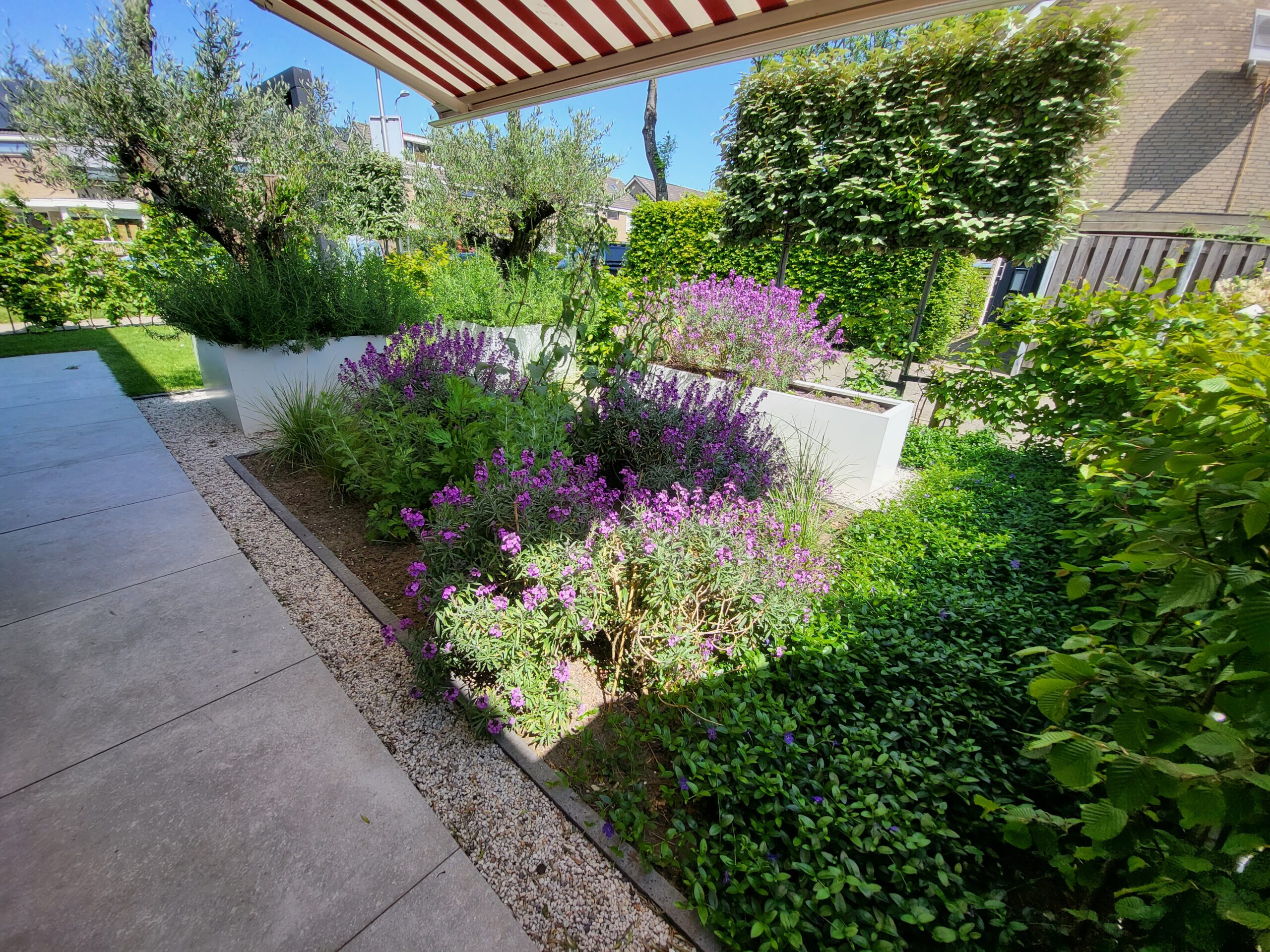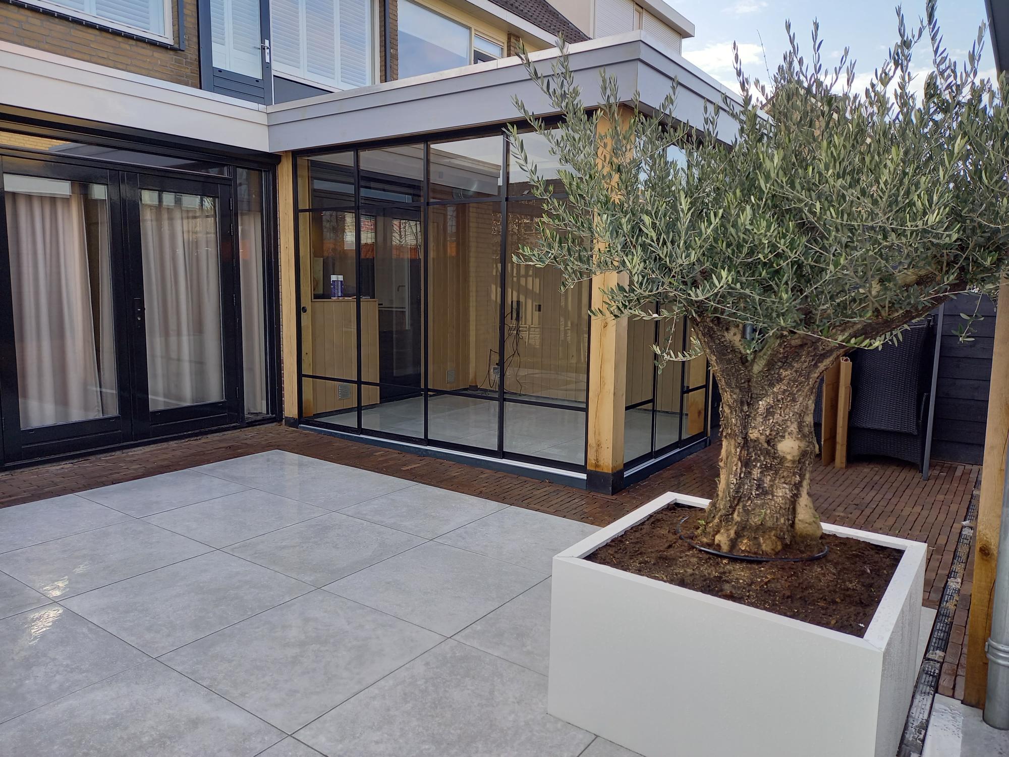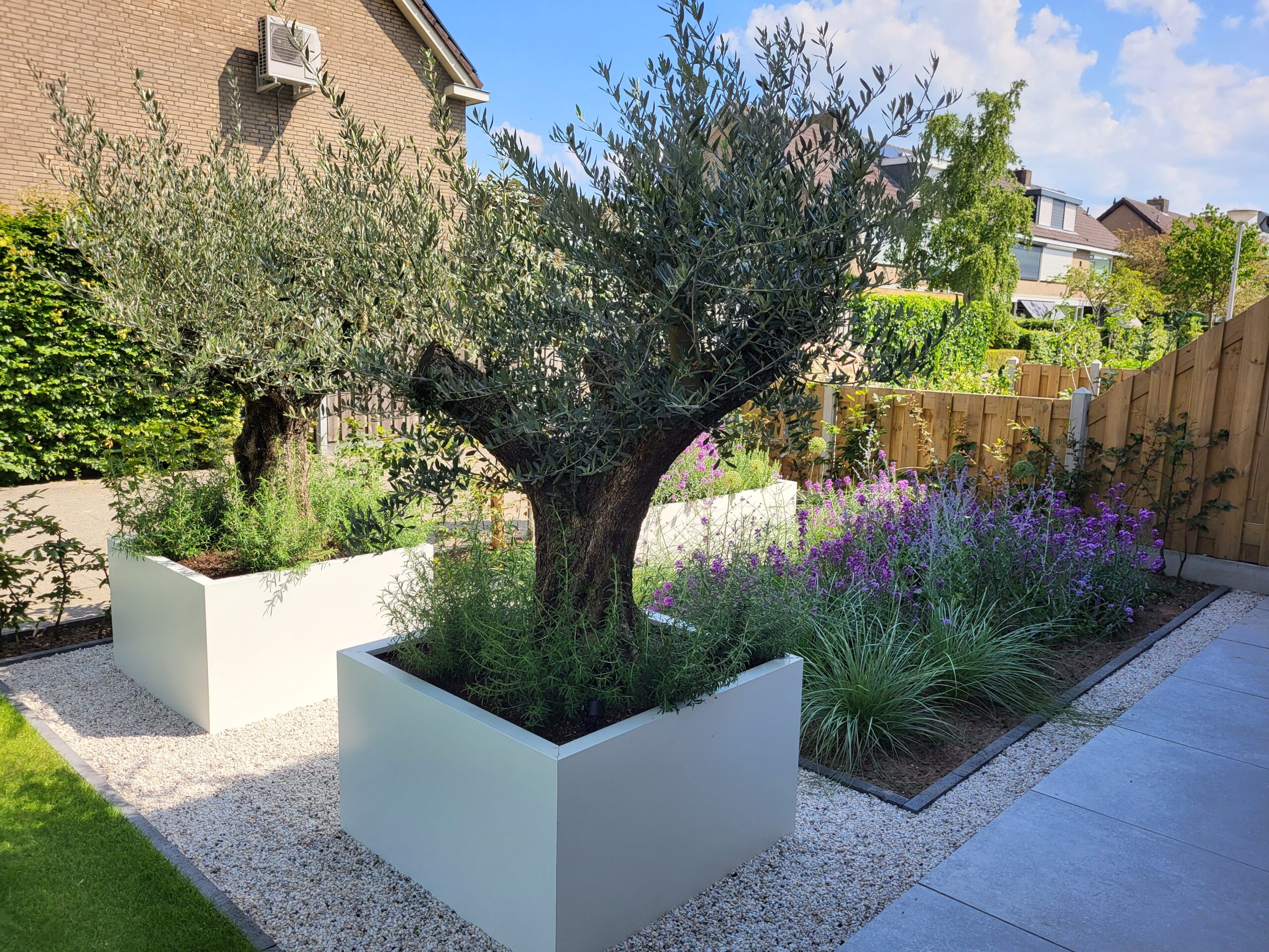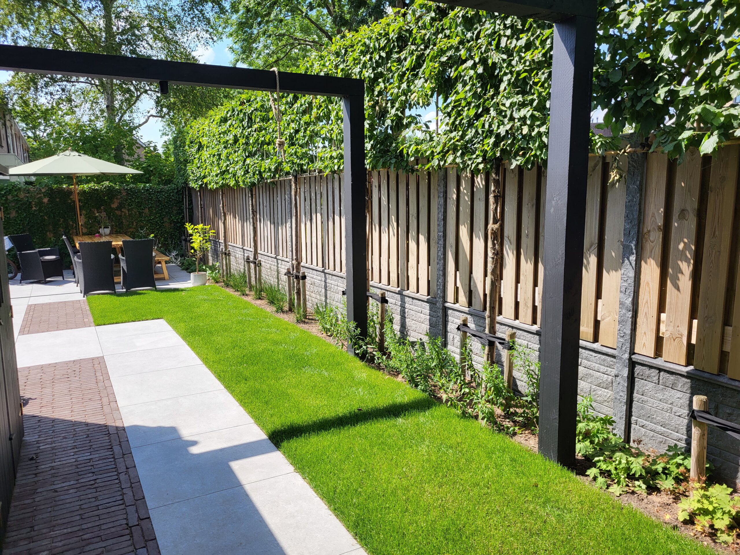 Bij NMtuinen worden we enthousiast van het creëren van buitenruimtes die niet alleen mooi zijn, maar ook een fijne plek vormen om te genieten van groen en buitenleven. In Oud-beijerland mochten we een tuin realiseren waar sfeer, functionaliteit en natuur samenkomen. We startten met een zorgvuldig samengestelde basis: een combinatie van keramische tegels, gebakken klinkers en een lichte kleur grind, wat zorgde voor een natuurlijke uitstraling en tegelijkertijd speels contrast. Om diepte in de tuin te creëren plaatsten we robuuste, zwart geverfde pergola’s die de ruimte niet alleen optisch vergroten maar ook zorgen voor een sfeervolle ‘omlijsting’. Voor het groen planten we borders aan vol bloeiende soorten, zodat de tuin door de seizoenen heen blijft verrassen met kleur. Daarnaast plaatsen we prachtige olijfbomen in strakke polyester bakken als knipoog naar de mediterraanse tuinstyle. Ook kregen leibomen op verschillende plekken in de tuin een plaats om de privacy te waarborgen. Deze tuin in Oud-beijerland is een perfecte mix van natuurlijk en tegelijk praktisch genieten. Wilt u ook een tuin waar groen en beleving centraal staan? Neem contact met ons op en we denken graag met u mee over de mogelijkheden!